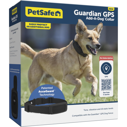 • When it comes to playtime, the more, the merrier! The Guardian Add-A-Dog Collar expands your Guardian GPS Dog Fence system to protect up to 8 pets, each with their own collar. Easily set up via the My PetSafe app, you can customize settings, monitor battery levels, and adjust correction modes. Choose from tone & vibration for training or up to 10 levels of static correction to suit your dogs needs. Equipped with the innovative AccuGuard technology, these collars integrate GPS satellite data, real-time motion detection, and AI to offer unmatched protection. They are waterproof and built to withstand any weather or playful splashes. The battery lasts 24 hours and recharges in just 2 hours, ensuring continuous safety. Please note compatibility with only the 1st and 2nd generations of the Guardian GPS Dog Fence. Your pet deserves the best. Trust PetSafe to keep your dog healthy, safe and happy.